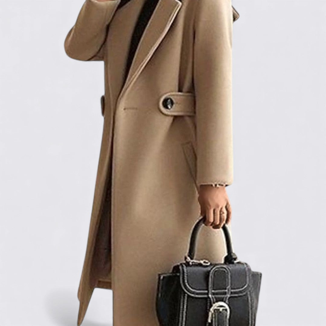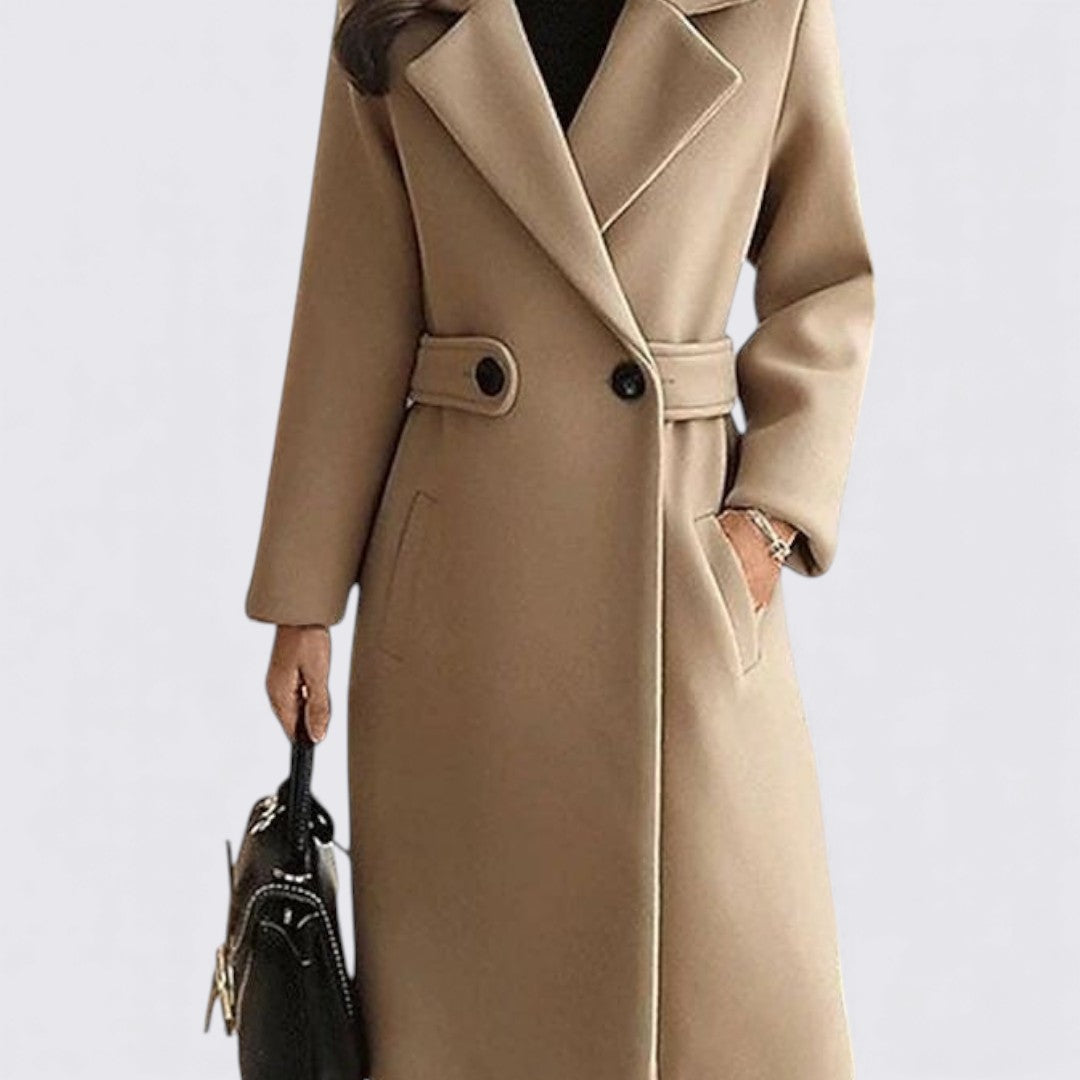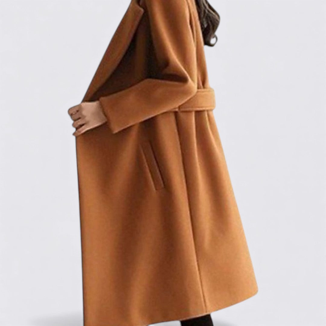 • Gürtel in der Taille: Ein prägendes Detail, das dem Mantel Struktur verleiht und das Gesamtbild klar gliedert.