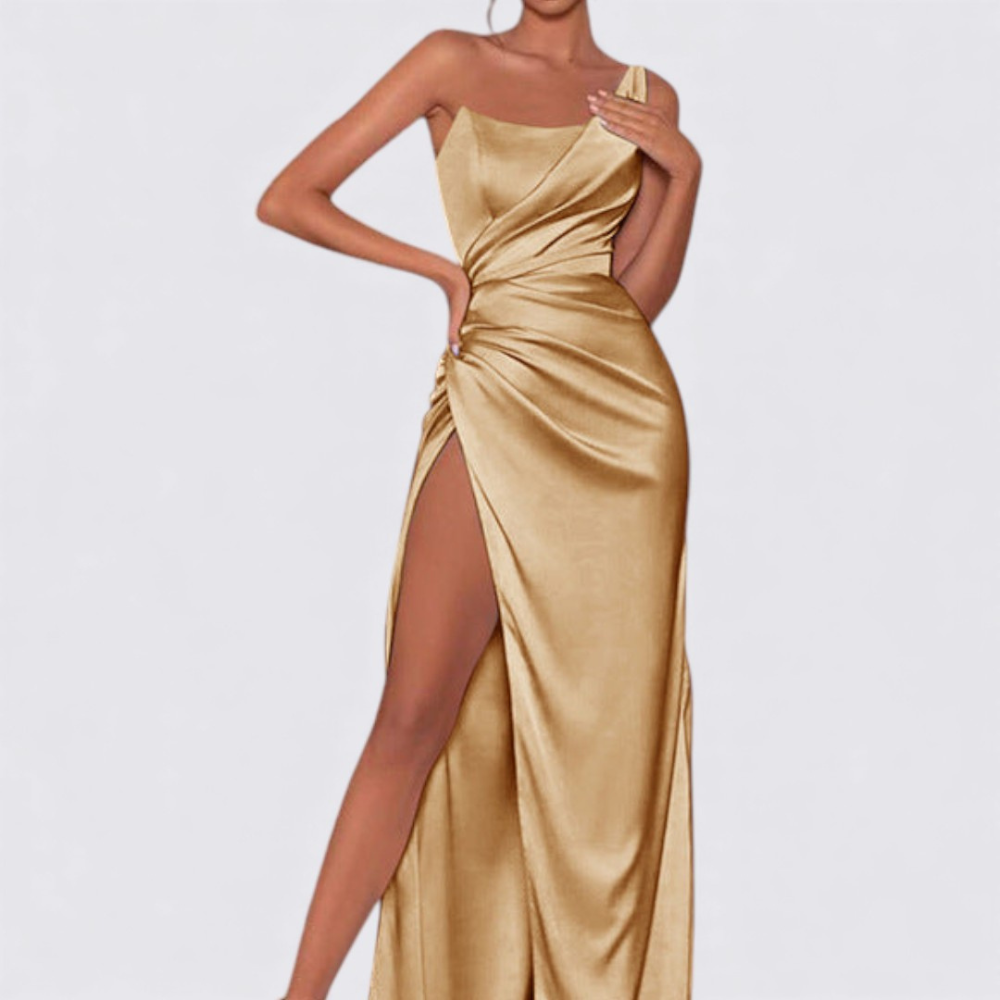 Seitlicher Schlitz: Dieses Detail bringt Dynamik in das Gesamtbild und unterstreicht die elegante Linienführung des Kleides.