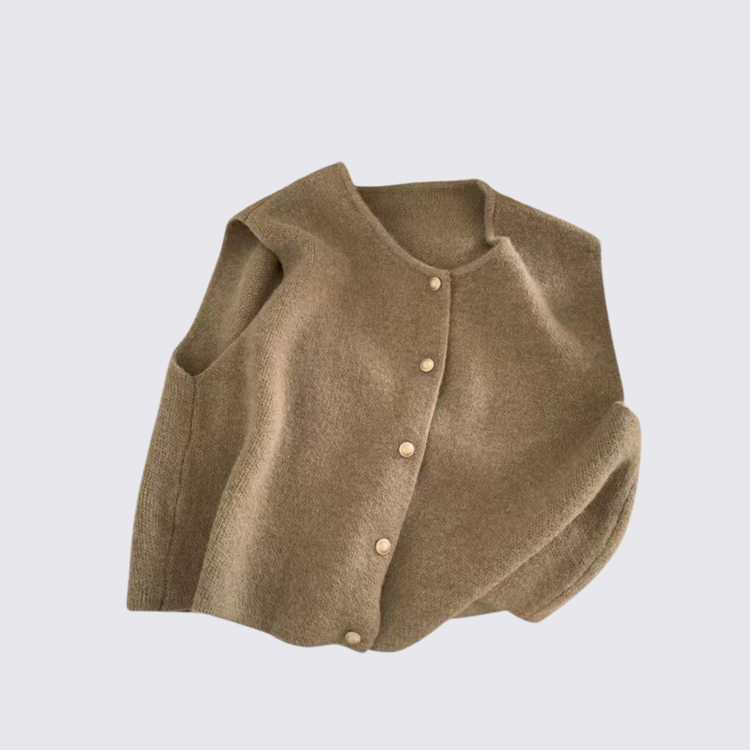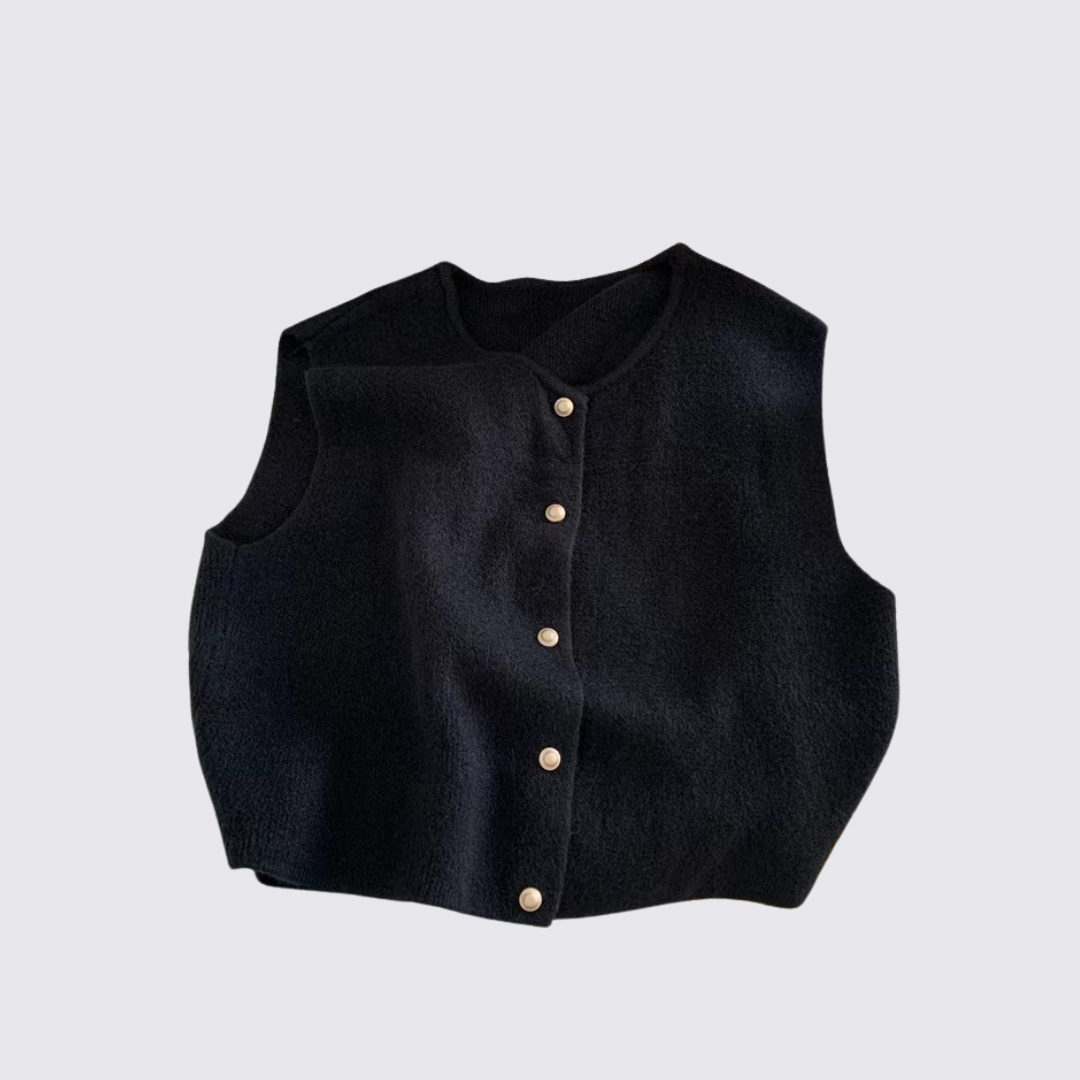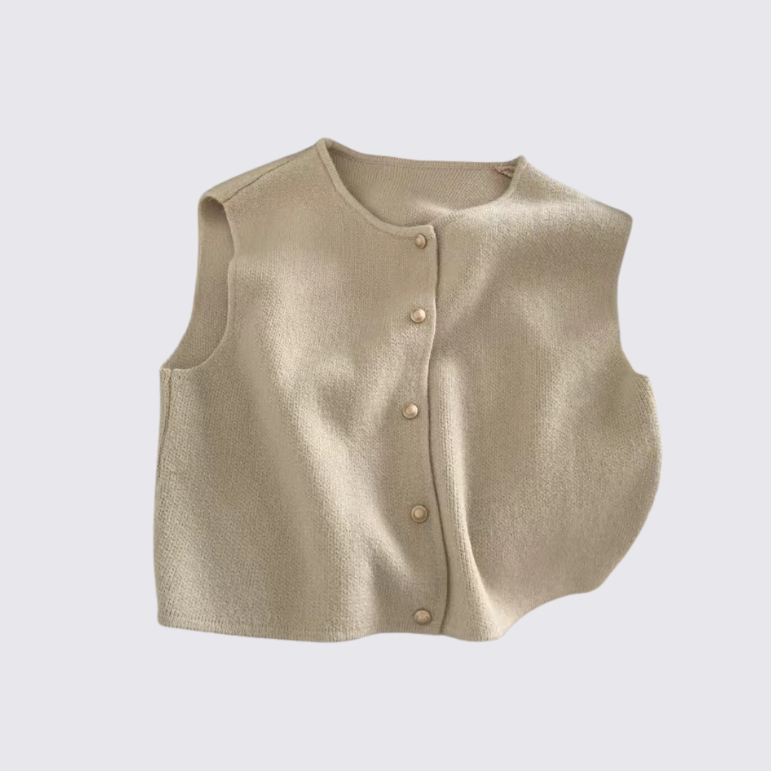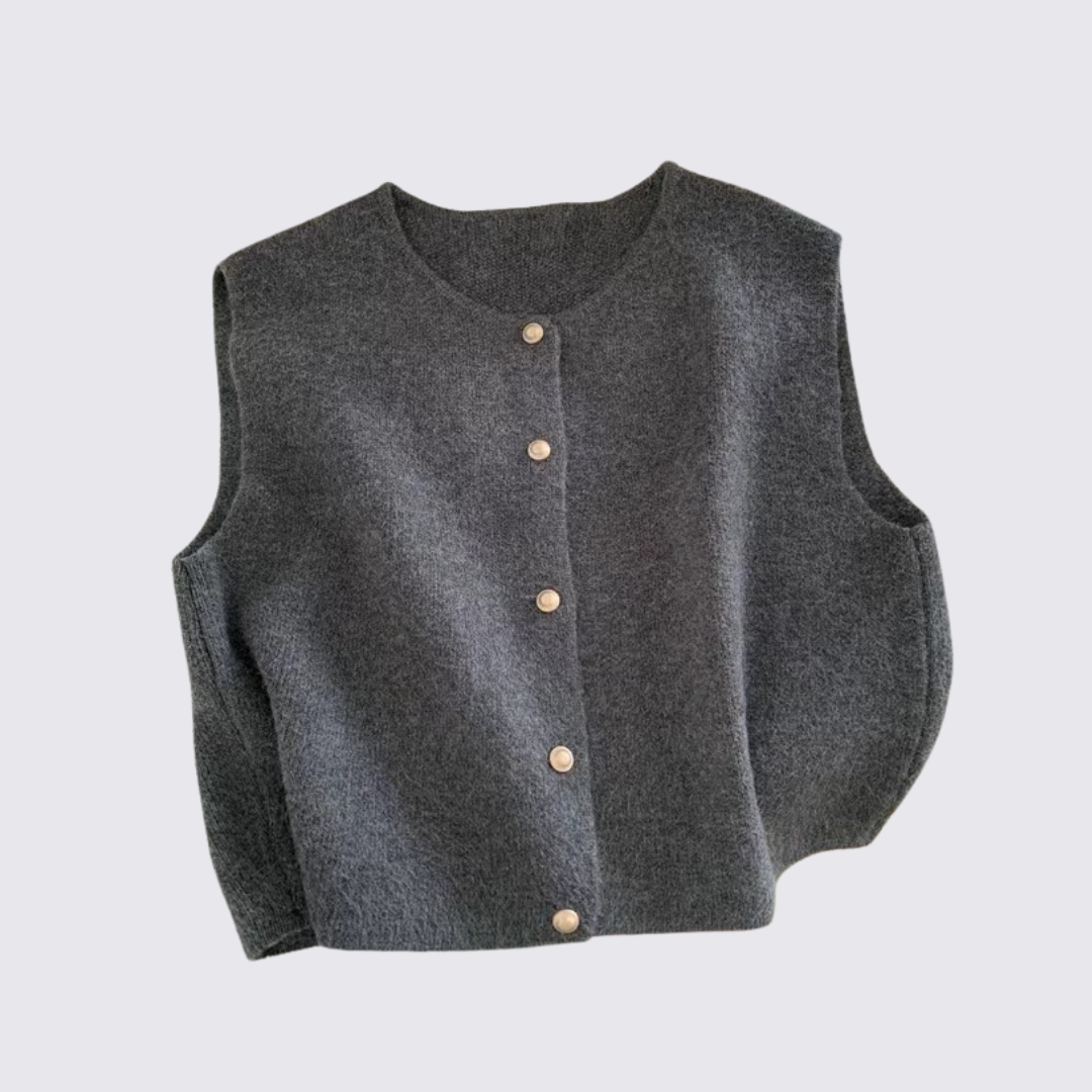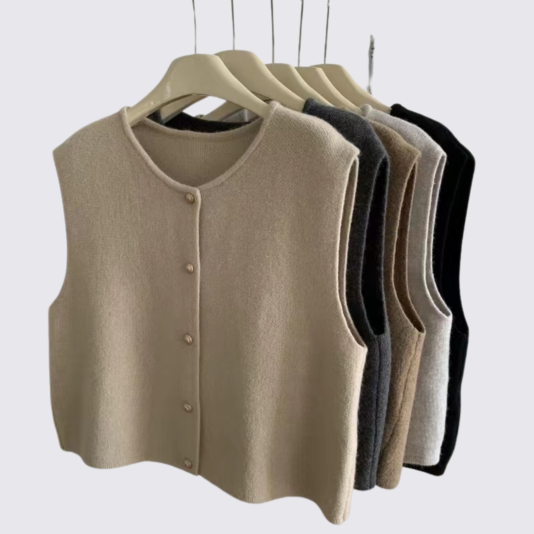Diese ärmellose Strickweste mit Knopfleiste überzeugt durch eine ruhige, klare Form. Die glatte Oberfläche und der gerade Schnitt machen sie zu einem vielseitigen Begleiter, den Sie mühelos über Blusen, Shirts oder feine Oberteile tragen können – ideal für Büro, Stadtgänge oder entspannte Alltagsmomente.