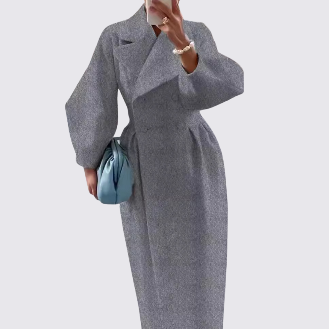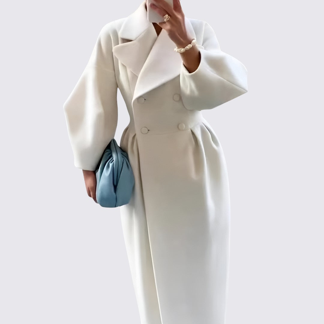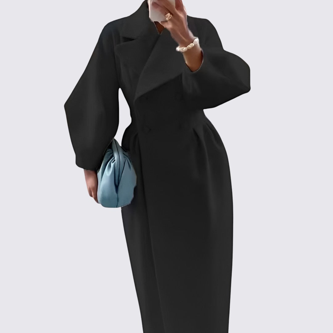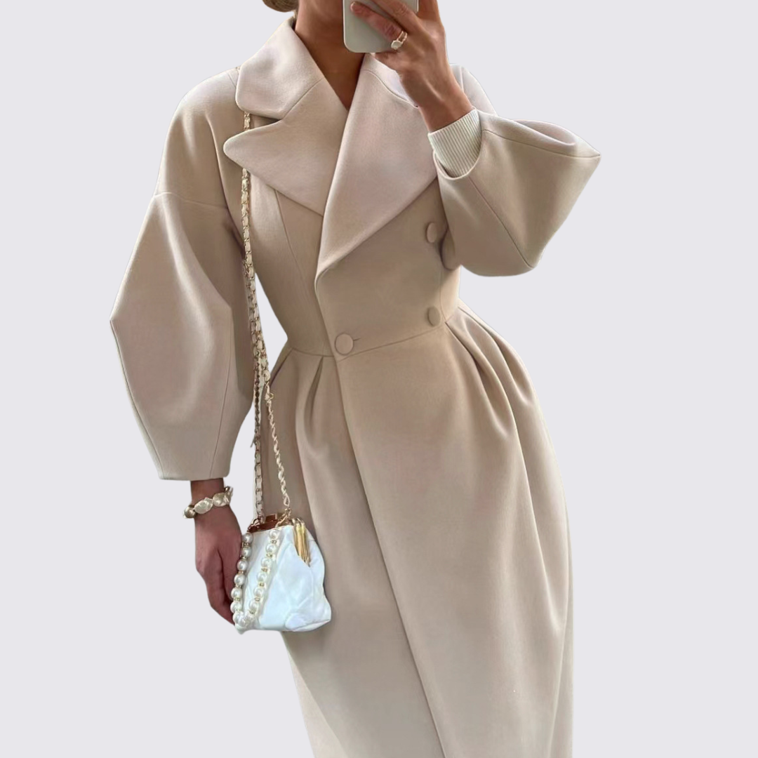 Taillierter Mantel mit breitem Revers für Damen. Die Front zeigt eine überlappende, zweireihige Knopfpartie. Formnähte und Falten akzentuieren die Taillenlinie. Die Ärmel wirken voluminös mit schmalen Bündchenabschlüssen. Seitliche Nähte verlaufen ruhig ohne zusätzliche Zierdetails. Die Länge reicht bis etwa zur Knielinie. Geeignet für Büro, Stadtbummel und Übergangszeit.